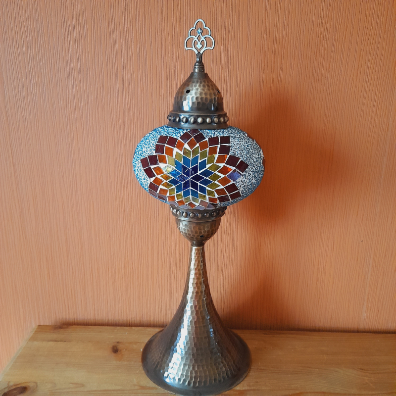 Eine Besonderheit unter den orientalischen Mosaiklampen. Mit einer herausragenden Höhe von 47 cm und einem Glasdurchmesser von 17 cm erstrahlt sie in voller Pracht.